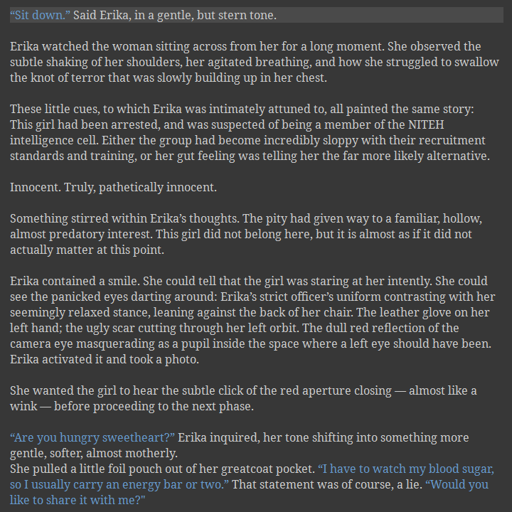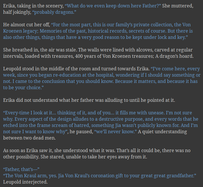 It has a bit of everything, mostly lore building and chronological data, but also a bunch of new elements and characters: Erika getting the Von Kraul arm from her father Leupold, a visit of the Von Kroenen family vault in the Wurmingstein imperial fortress, an interrogation scene with the daughter of a diplomat… Hell, I even wrote a mini scene involving a social media influencer being forced to Vlog her own arrival in the Froznovia penal colony (this is absolutely not canon, but it was funny, in a way that a corpse is funny).